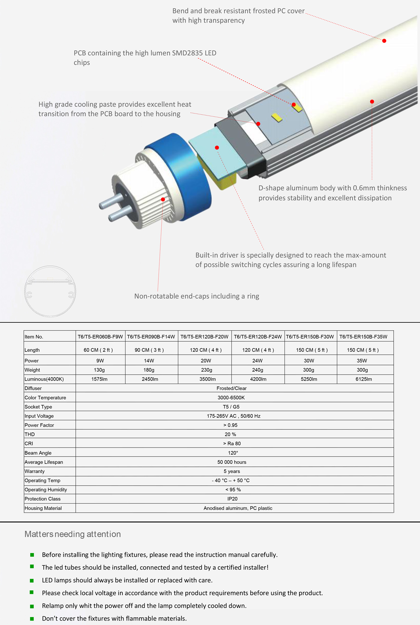 ProA Plus Series T5 180lm/w Tube adopts high lumen SMD LED, which provides excellent lumen output, high luminous efficiency, long-lasting stability and splendid sight.